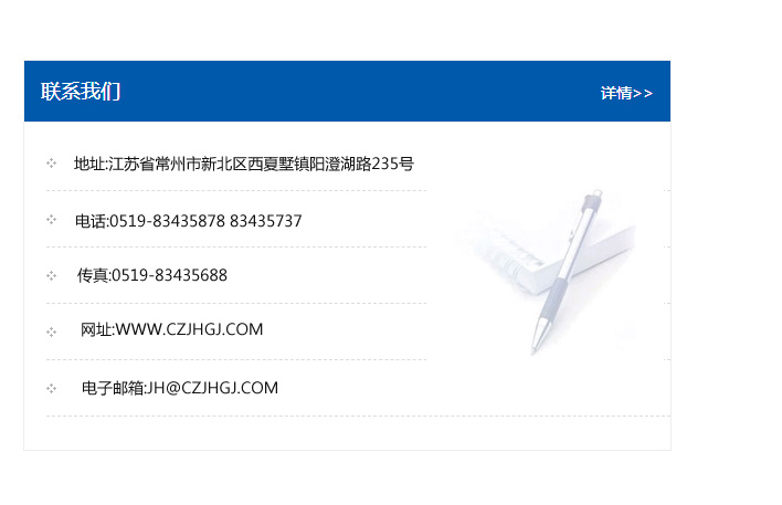 地址:常州市新北區友邦商務大廈1幢16、17層  電話:0519-85101652  傳真:0519-85112595  郵編:213022  網址:www_cz-jiayue_cn.sdbmxx.com  郵箱:xiajifengaa@163.com